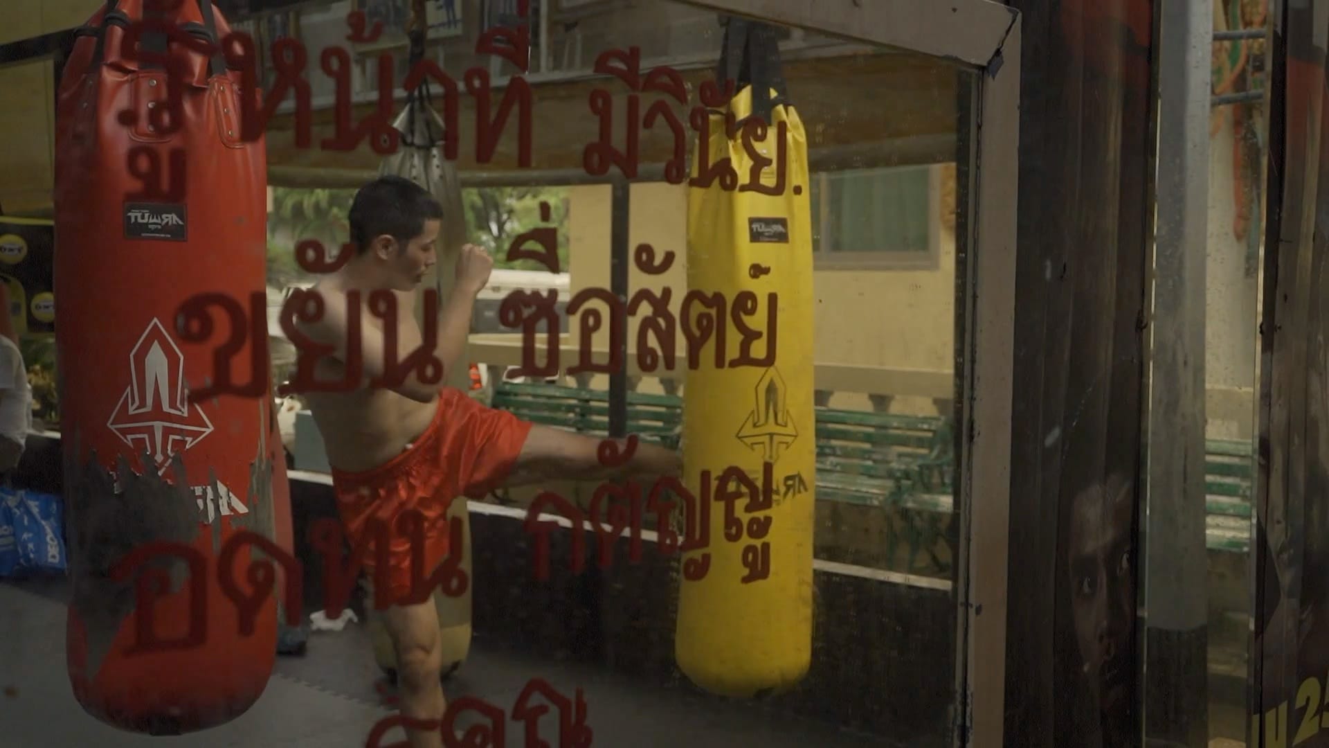 As part of Red Eagle Sangmorakot, the artist trained for three months in traditional Muay Thai boxing at the Sangmorakot Academy in Bangkok. “The trainer taught me techniques like straight punches, uppercuts, elbows, knee strikes, kicks, push kicks, and defensive moves,” explains Siriphol. “After some time, I started to get used to the intensity of the workouts, but over three months I felt shin pain from improper kicking, abrasions from striking the heavy punching bag, bruised knees, and sore elbows.”
